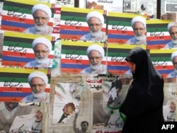 Ирандык аял президенттикке талапкердин сүрөтү тагылган тактанын алдында.