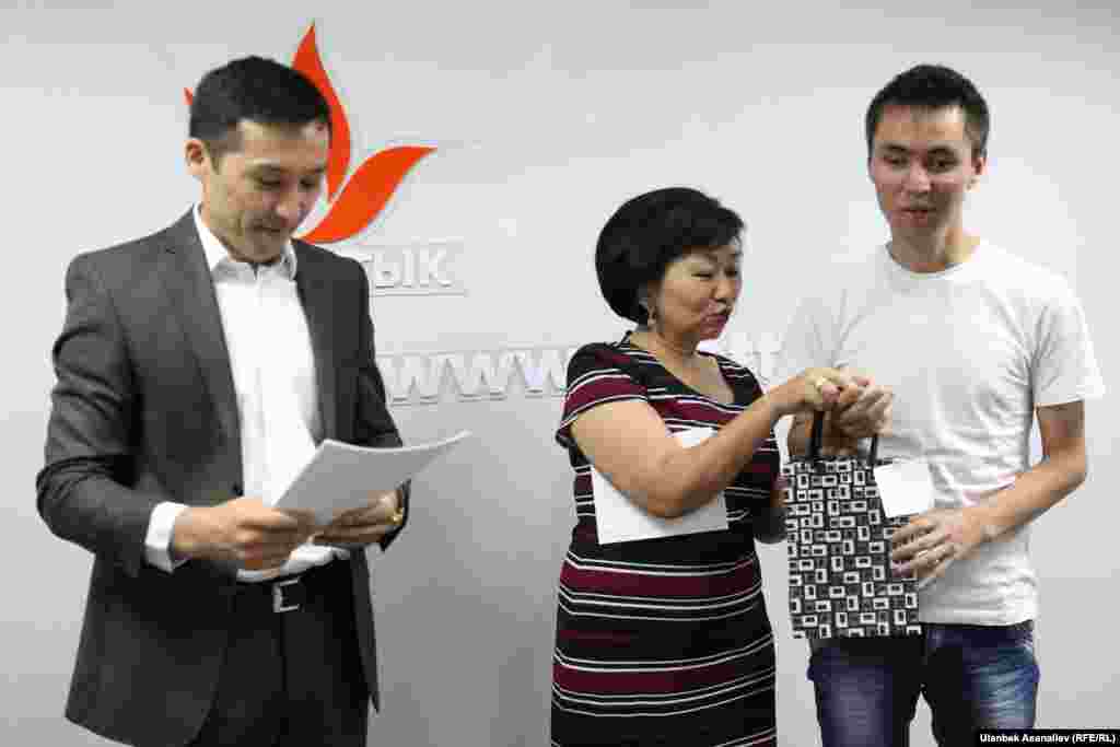 “Азаттык” радиосу үч ай мурда жарыялаган “Жашооң кандай, студент?” аттуу online сынак жыйынтыкталып, бүгүн жеңүүчүлөргө белектер тапшырылды. Сынактын жыйынтыгы менен 6 студент жеңүүчү деп табылды. Эң мыкты эссе жазган төртөө Samsung Galaxy Tab4 планшети менен, экөө Samsung Galaxy Trend смартфону менен сыйланды.
