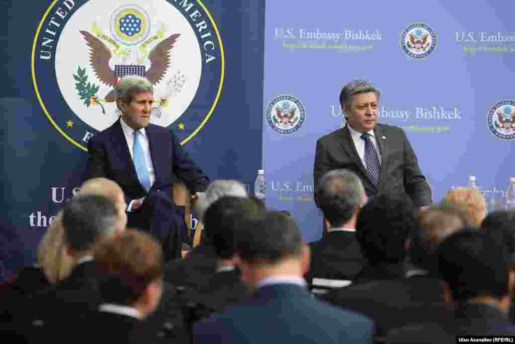 Жон Керри Борбор Азия республикаларын кыдыруусун бүгүн Бишкектен баштады. Алгач ал АКШнын Кыргызстандагы элчилигинин жаңы имаратынын ачылышына катышты. Андан соң президент Алмазбек Атамбаев менен жолукту. Жолугушуудан кийин маалымат жыйында эки тараптуу сүйлөшүү ачык-айкын өткөнүн, бардык маселелер боюнча пикир алышуу болгонун билдирди. Керри Кыргызстанды парламенттик шайлоону ийгиликтүү өткөрүп алышы менен куттуктады. АКШ мамкатчысы бул жолугушуулардын кийин Борбор Азиядагы Америка университетинин жаңы имаратынын ачылышына катышып, студенттер менен жолукту.
