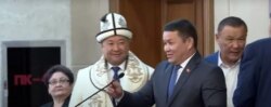 Жаңы шайланган төрага Талант Мамытов экс-төрагалар Канатбек Исаев менен Дастан Жумабековдун башына калпак кийгизип, чапан жапты.