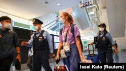Токио. Беларустук жөө күлүк Кристина Тимановская Жапониядагы Польшанын элчилигине кирип баратат. 2-август, 2021-жыл.