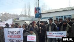 Сторонники экс-министра обороны Кыргызстана И.Исакова отвели властям срок до 15 марта этого года оправдать и выпустить на свободу генерала. В противном случае тысячи земляков И.Исакова из Алайского района намерены начать пеший марш в сторону кыргызской столицы – Бишкек. Накануне в административном центре Алайского района – с.Гульчо прошел митинг сторонников осужденного на 8 лет в колонии усиленного режима И.Исакова.