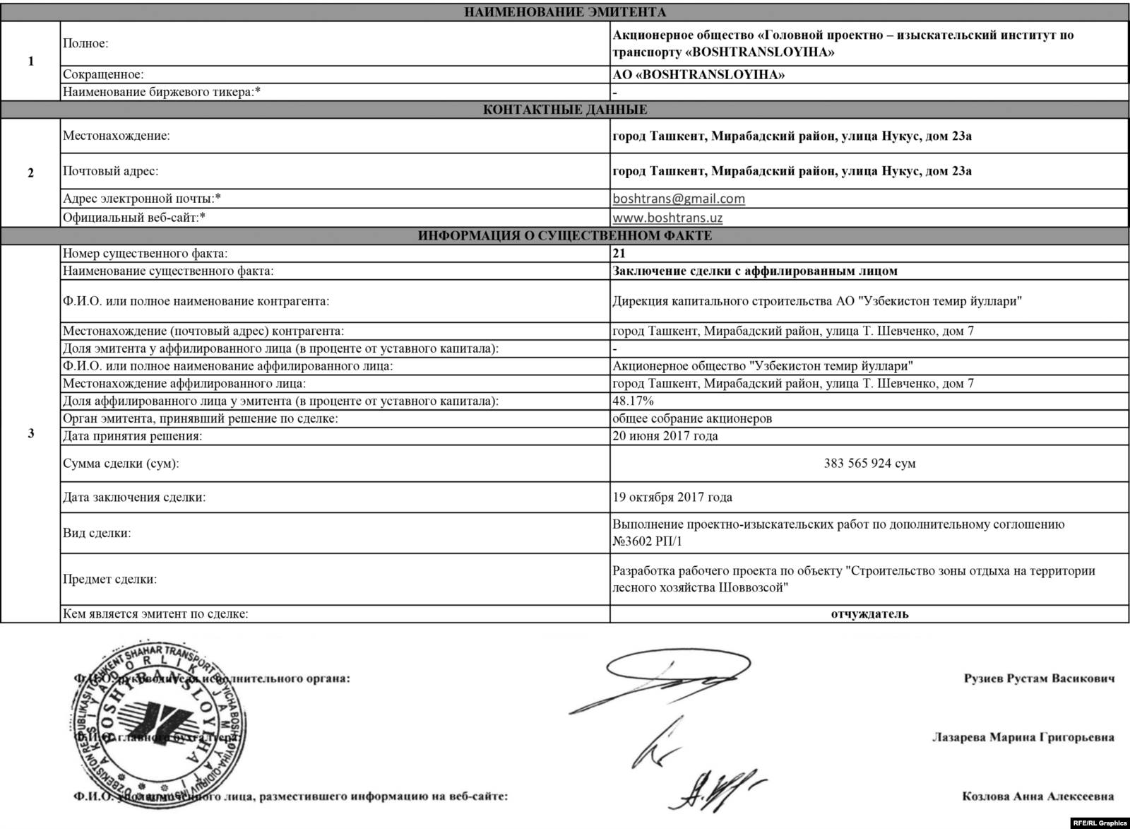 «Боштранслойиха» жана «Узбекистон темир йуллари» компанияларынын ортосунда 2017-жылдын июнь айында кол коюлган Шоввозсой резиденциясын өнүктүрүү боюнча келишим.