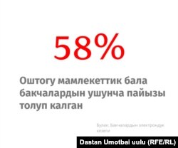 Бала бакчанын имаратынын канча баланы батыра ала турганы боюнча норма бар. Биз аны бакчага барган балдардын реалдуу саны менен салыштырып көрүп, Оштогу бала бакчалардын жарымынан көбү толуп калганын аныктадык.
