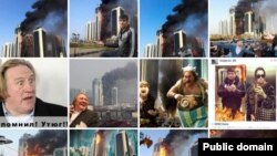 Бир фото коллажда Рамзан Кадыров өрттөлүп жаткан имараттын алдында лезгинка бийин бийлеп жатканы көрсөтүлгөн. Дагы бир коллажда: “Аллах берет, Аллах алат” деп жазылып жүрөт.