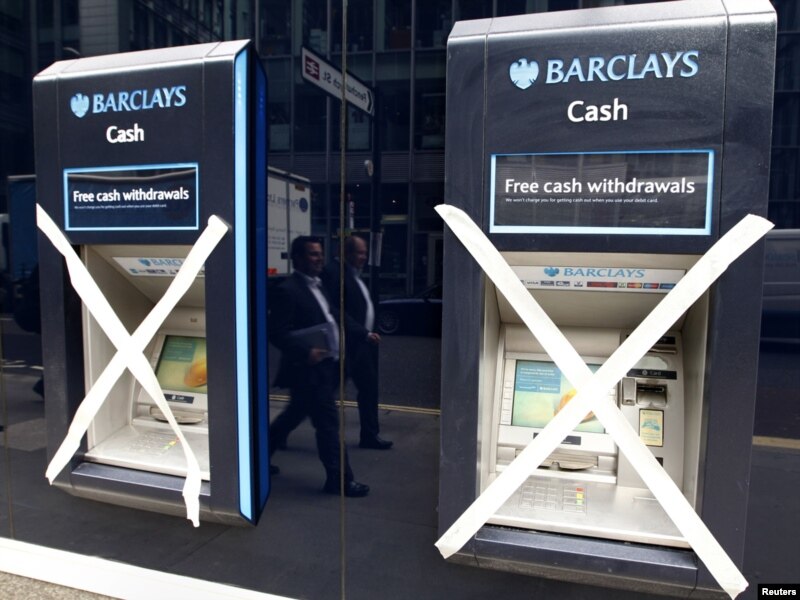 Лондондогу Barclays банкынын жанындагы иштебей турган банкоматтар. Лондон, 31-август 2011