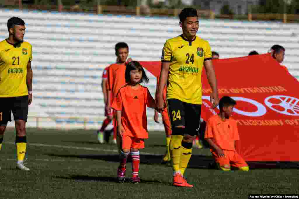 Футболчулар беттештин алдында оюн талаасына "Күн балдары" менен чыгып келаткан учур.