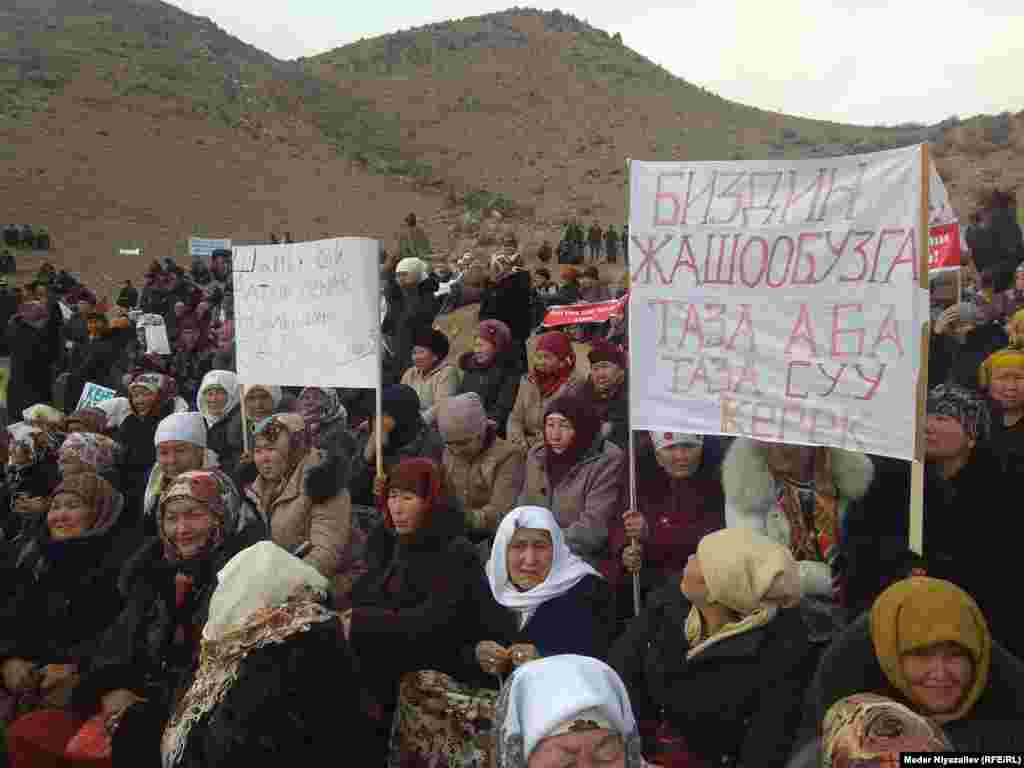 Алар Шамбесай алтын кенин жабууну жана анда иш алып барып жаткан компаниялардын аймактан чыгып кетишин талап кылышууда. Чогулгандар ошондой эле кенди иштетүү экологияга зыян экенин, кенден мамлекет да, эл да пайда көрбөй турганын айтып жатышат. (Медер Ниязалиевдин сүрөттөрү)