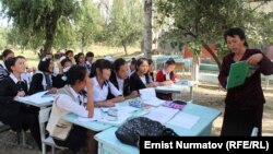 Күндүн ысыгынан качып, окуучулар теректердин арасына кирип алышкан. "Бирок эми күн жаагандан Кудай сактасын", - дейт мугалим Мутабар Эргешова: