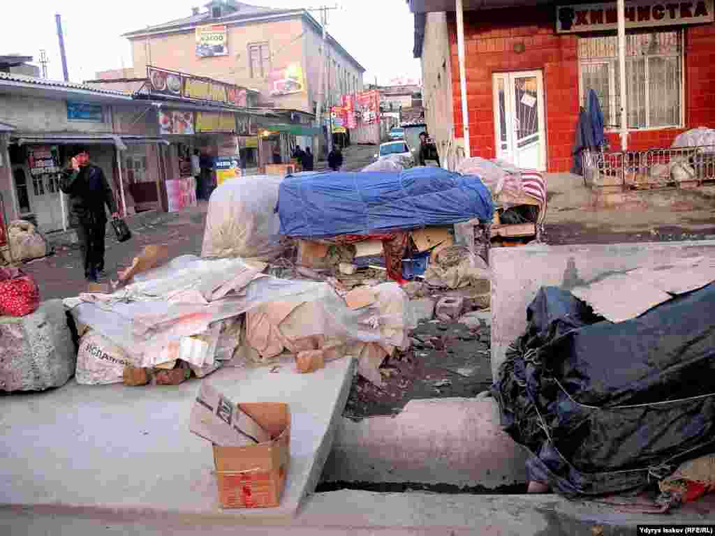 Оштогу курулушу токтоп калган көпүрөнүн айланасында кыймыл жандуу. Ар ким алына жараша соодасын кылып, бири эртеден кечке термоско демделген чайын сатса, дагы бири уйдун шыйрагын тазалап көчөгө алып чыгат. Башкасы кадимкидей эле Кытайдын кийимин жол боюна жая салат. Жолдогу чаӊды сапырылта зуулдаган таксилердин да жаны тынбайт.