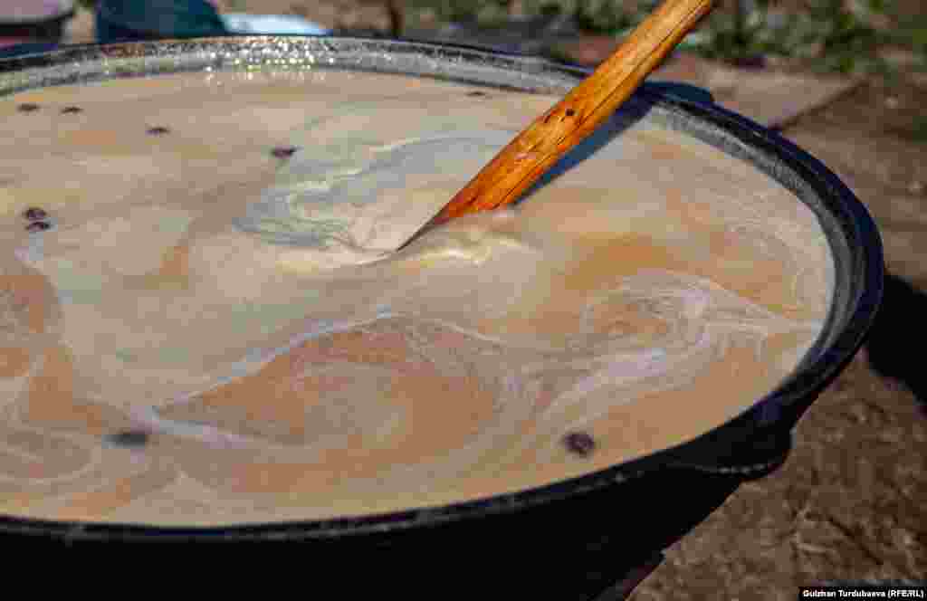 Буудайдын ширелүү суусун дакиден өткөрүлүп, казандын кулагынан бир карыш кем куюлат.