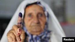 Ливиялык аял шайлооканада добуш бергенден кийин. Триполи, 7-июль, 2012
