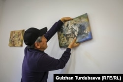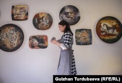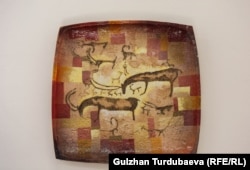 Жумагул Ташиев Саймалуу-Таш петроглифтерин керамика өнөрүндө чагылдырып, байыркы эски замандын демин жаңы формага салып, ошол таш белгилерде катылган терең философиялык маанини көргөзүүдө. СүрөтGulzhan Turdubaeva (RFE/RL)