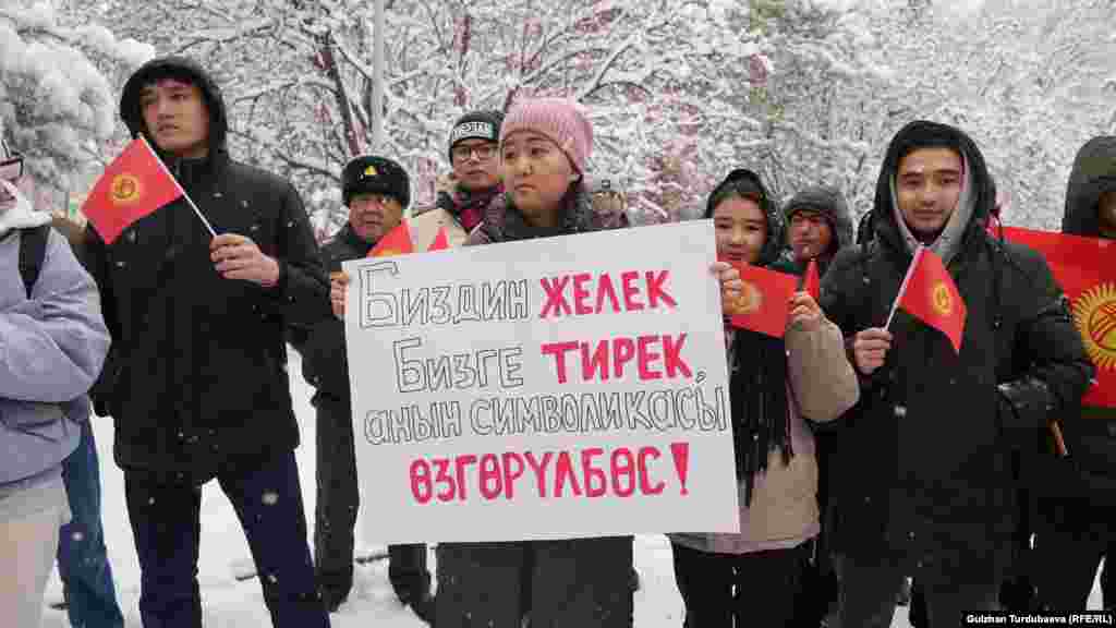 Бишкектеги Максим Горький атындагы гүлбакта мамлекеттик тууну өзгөртүүгө каршы митингге 50дөй киши топтолду. Чогулгандар "Тууга тийбе" жана "Афтандилге боштондук" деп ураан чакырышты.