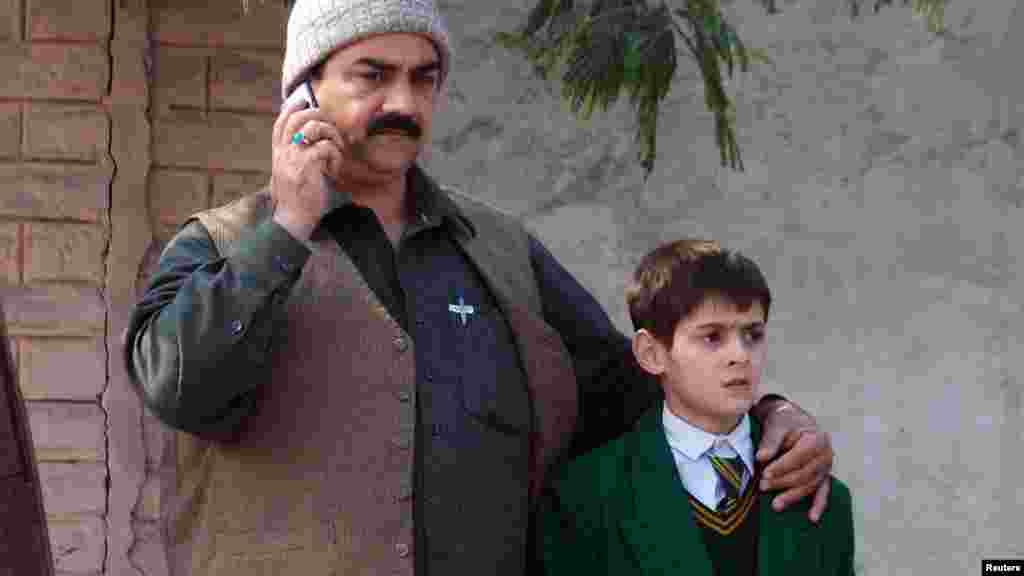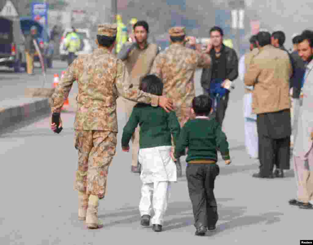 Pakistan -- Schoolchildren cross a road as they move away from a military run school that is under attack by Taliban gunmen in Peshawar, December 16, 2014