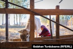 28 жаштагы Айгерим айылда жашаган миңдеген аялдар сыяктуу эле эрте туруп, уй саайт.